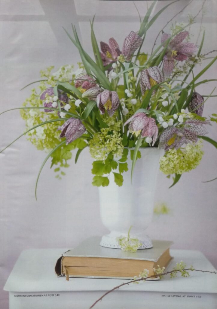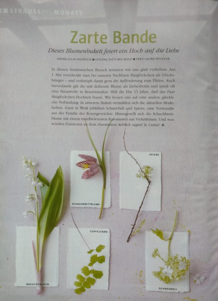 On pourrait facilement tomber amoureux de cette coutume française : le 1er mai, chez nos voisins, on offre du muguet comme porte-bonheur – en y associant volontiers une invitation à flirter. Chez nous aussi, cette fleur au parfum doux est considérée comme messagère d’amour et joue souvent un rôle principal dans les bouquets de mariée. Si un mariage dure 13 ans, le couple peut célébrer ses noces de muguet. Nous nous réjouissons d’une autre heureuse union : dans notre bouquet, les couleurs actuelles de la mode s’unissent. Entièrement blancs, la viorne et la spirée – une parente de la famille des rosacées – s’épanouissent. S’y ajoute la fritillaire pintade, avec son motif à carreaux violet très tendance. Et que diraient les Français devant ce charmant spectacle ? Je t’aime !