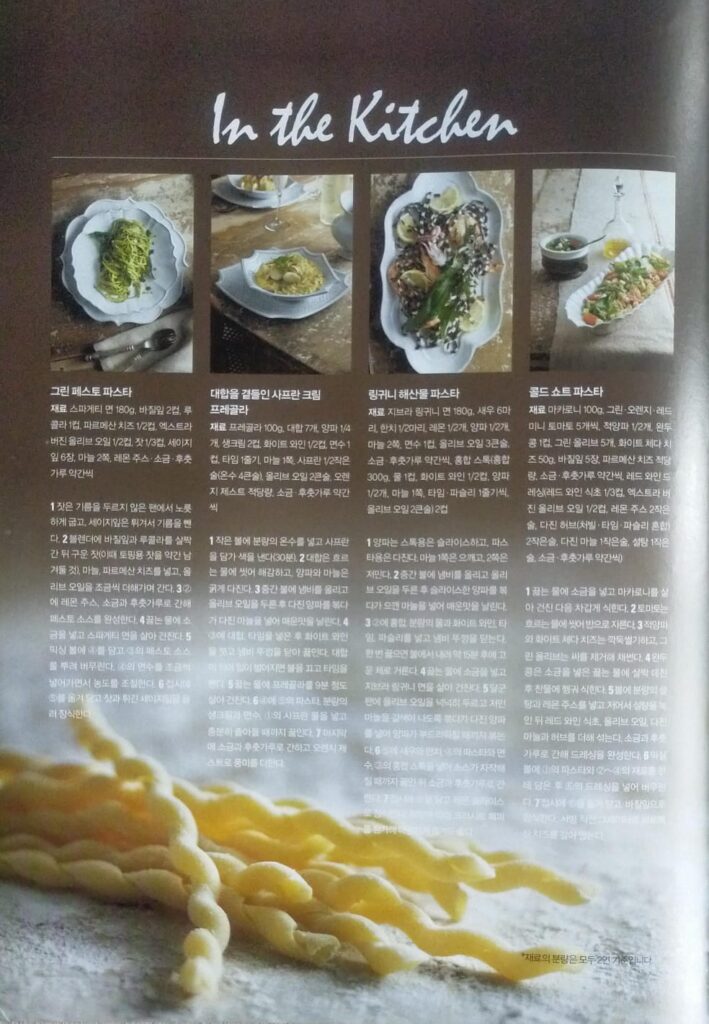 Le texte coréen est dense et en petits caractères sur les images : il s’agit principalement de descriptions culinaires détaillées (ingrédients, sensations, conseils), mais la structure éditoriale est claire :