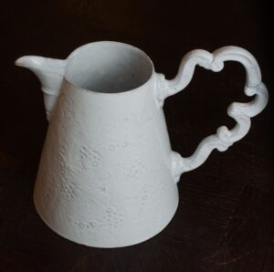 "Grand pichet-vase Régence " imaginé par Jean-Baptiste Astier de Villatte et réalisé en faïence brune émaillée en blanc brillant. Estampillé "JB AdeV, créations depuis 1993", éditeur. 34x21,5x25cm C 002 161 001