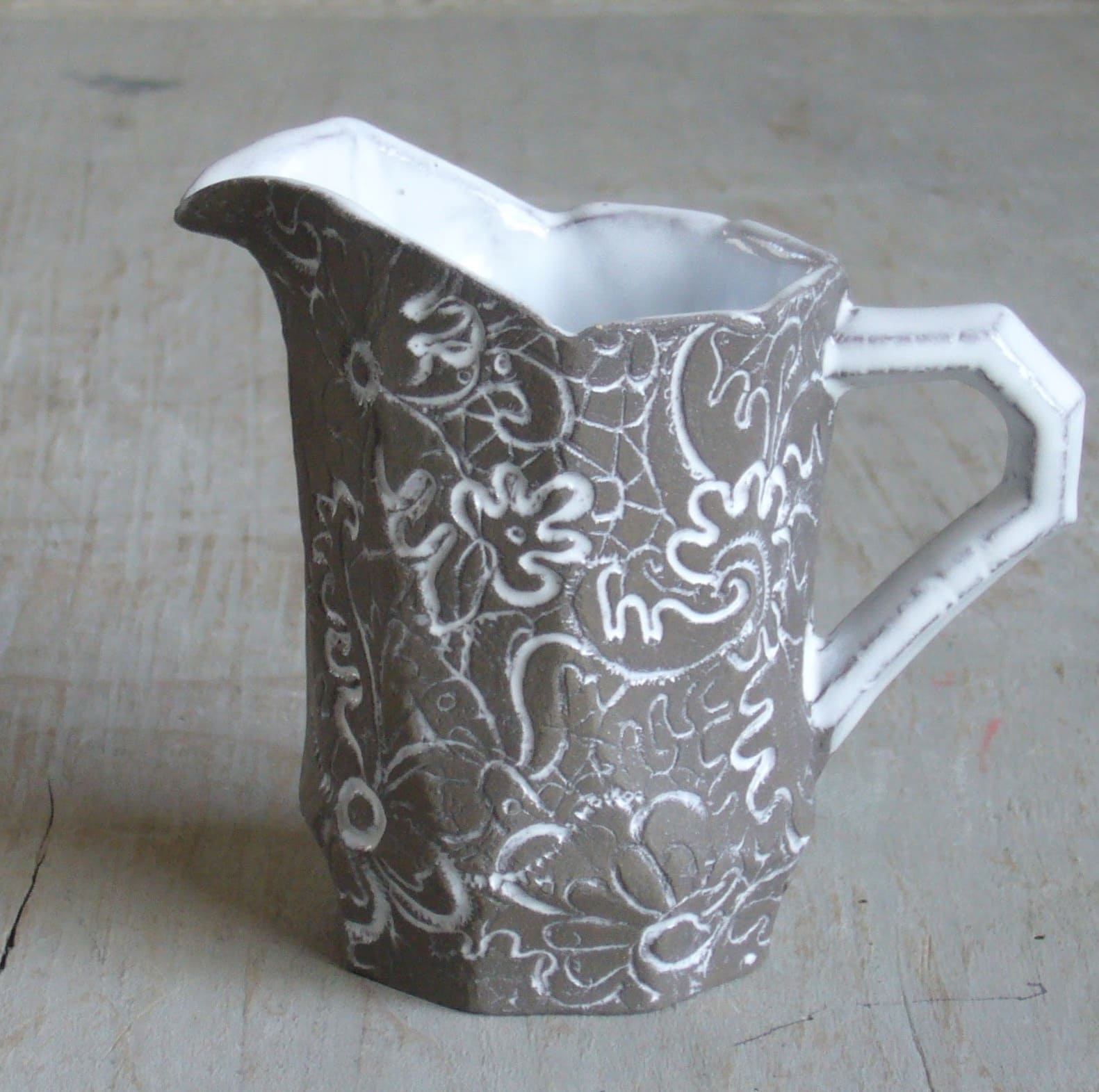 "Petit pot à lait octogonal Régence" imaginée par Jean-Baptiste Astier de Villatte et réalisée en faïence brune Rébecca blanc désémaillé brut . Estampillé "JB AdeV, créations depuis 1993", éditeur.