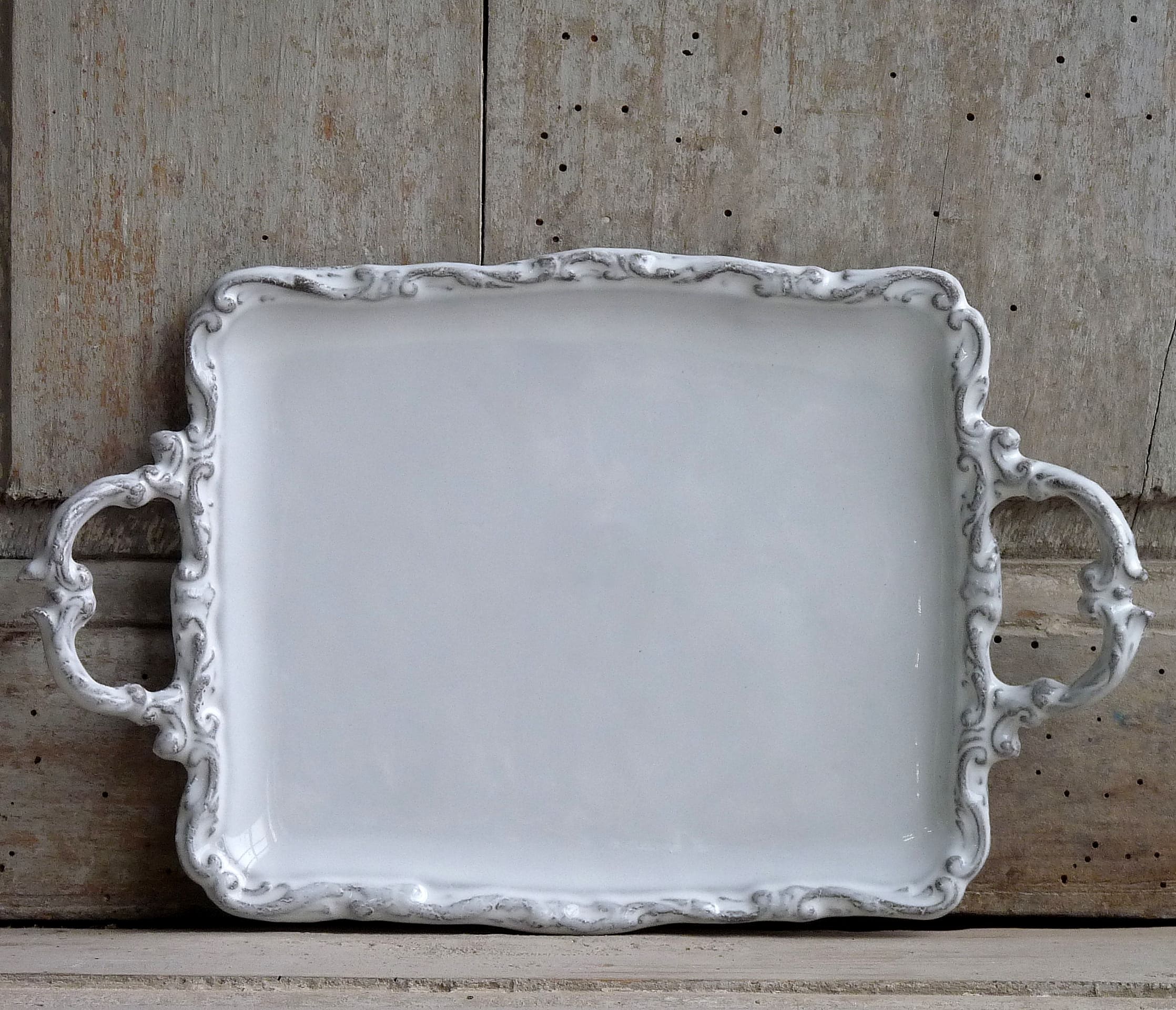 "Petit plateau à anses Louis XV baroque" imaginé par Jean-Baptiste Astier de Villatte et réalisé en faïence brune émaillée en blanc . Estampillé "JB AdeV, créations depuis 1993", éditeur.