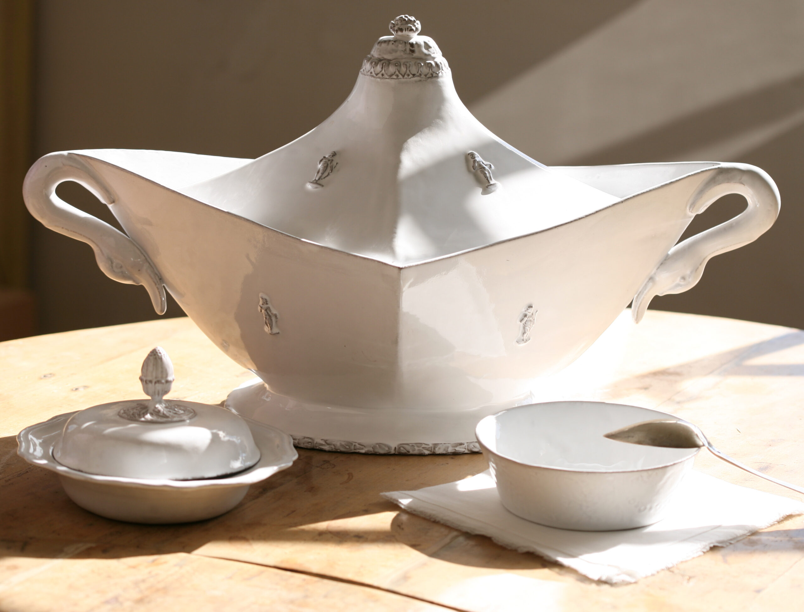 "Grande soupière col de cygne Empire " imaginée par Jean-Baptiste Astier de Villatte et réalisée en faïence brune émaillée en blanc brillant. Estampillé "JB AdeV, créations depuis 1993", éditeur.