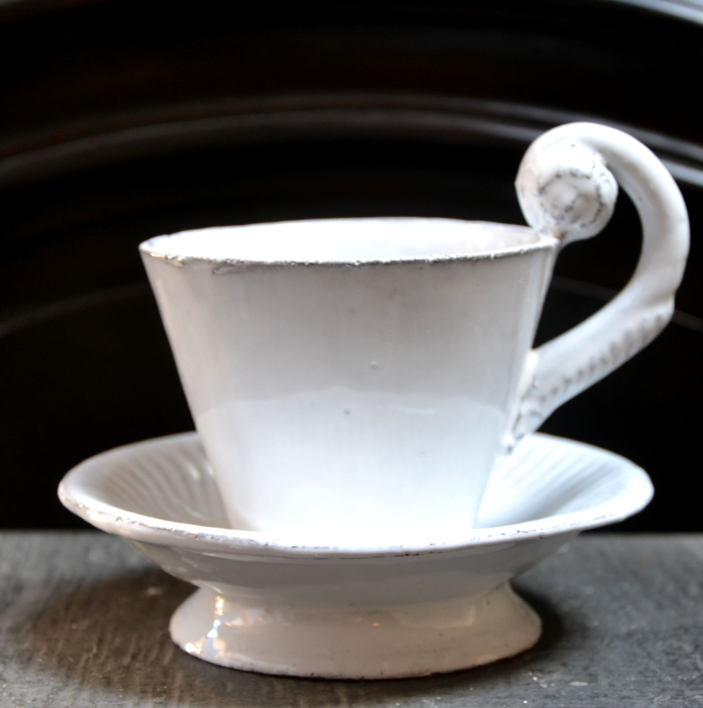 "Tasse à thé tronconique Empire tête" imaginée par Jean-Baptiste Astier de Villatte et réalisée en faïence brune émaillé en blanc. Estampillé "JB AdeV, créations depuis 1993", éditeur.   C 020 1072 000