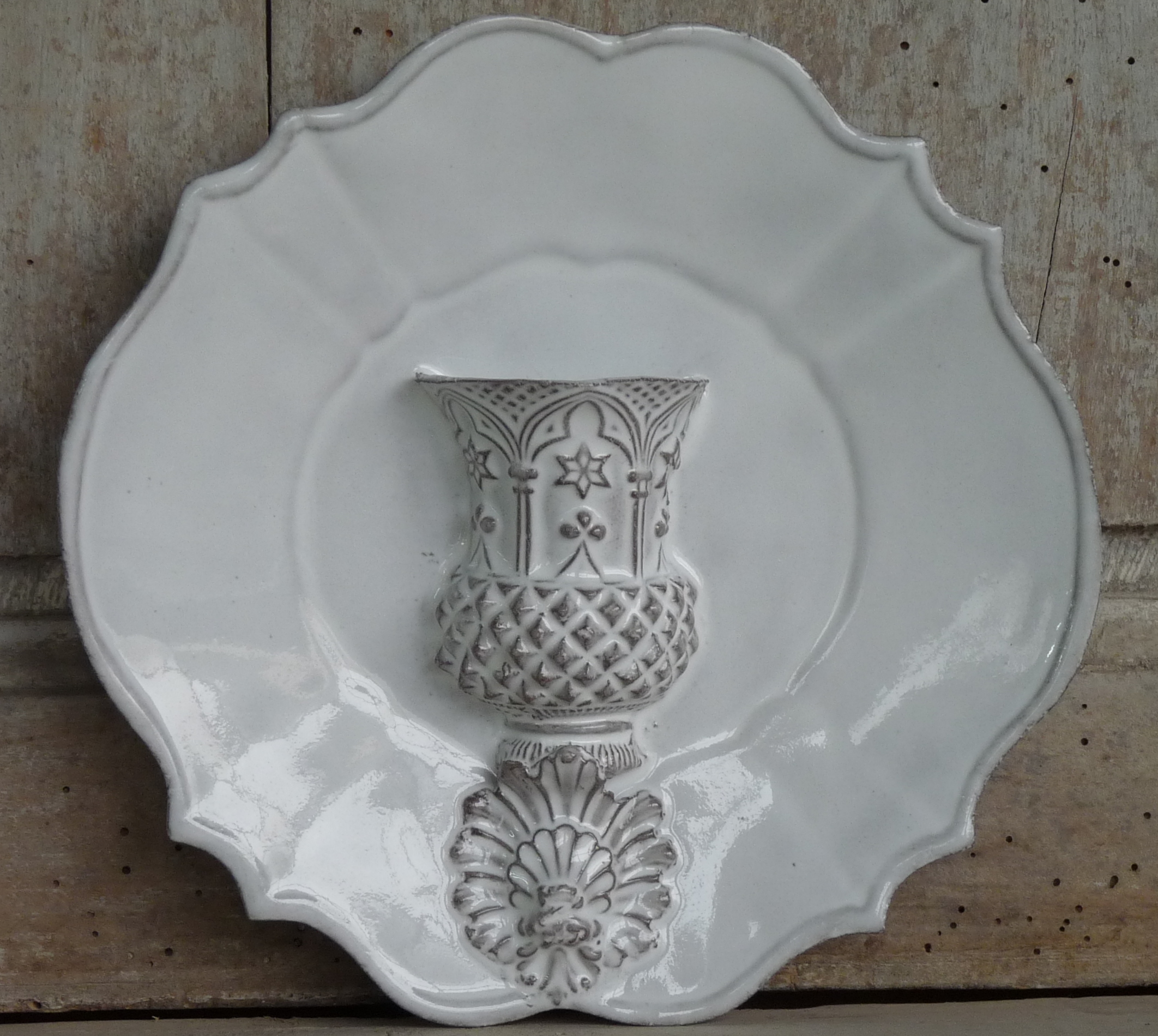 "Vase-assiette Médicis annanas " imaginé par Jean-Baptiste Astier de Villatte et réalisées en faïence brune émaillée en blanc brillant. Estampillé "JB AdeV, créations depuis 1993", éditeur.