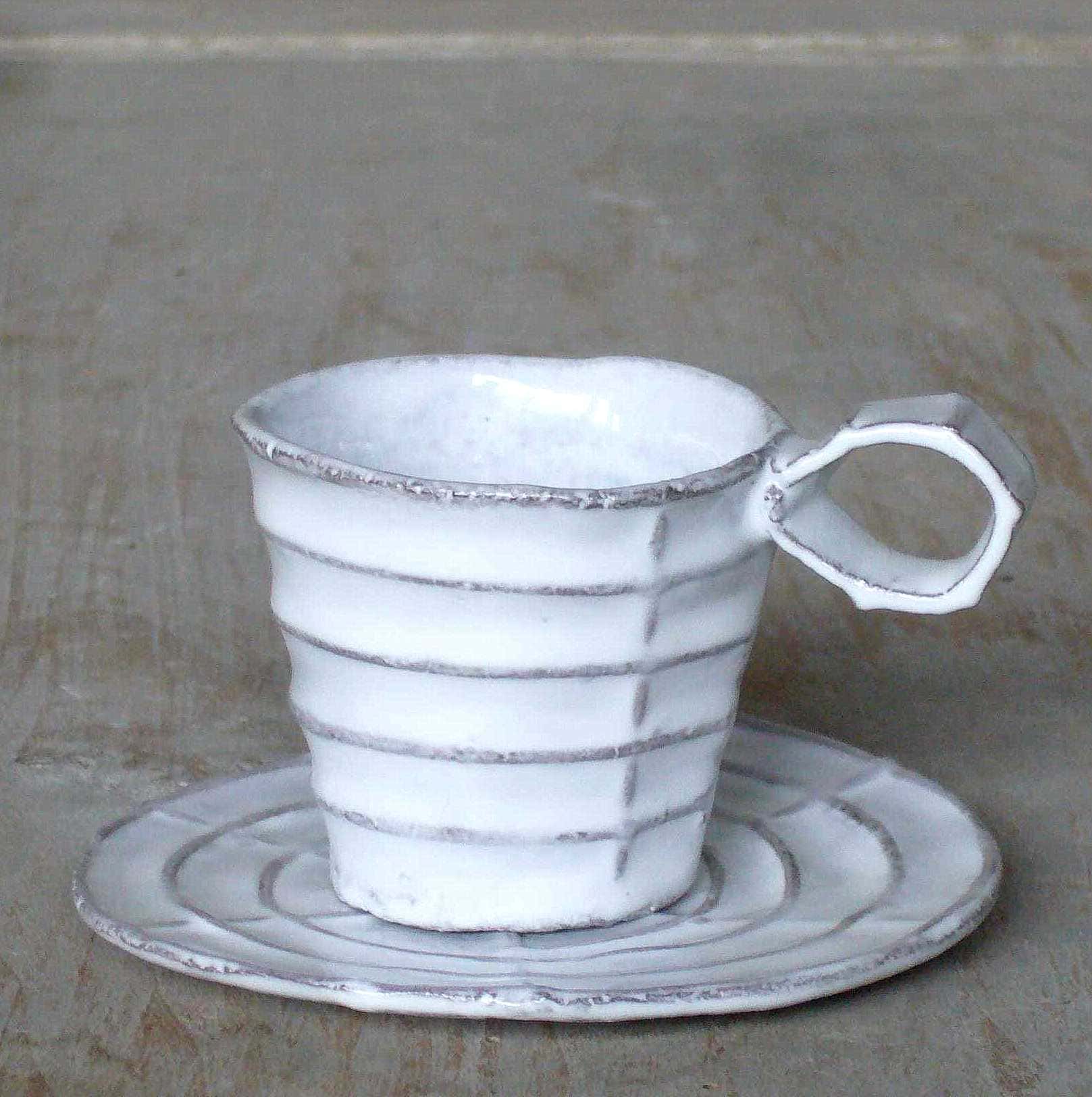 "Tasse à café & soucoupe Deschamps " imaginées par Jean-Baptiste Astier de Villatte et réalisées en faïence brune émaillée en blanc brillant. Estampillé "JB AdeV, créations depuis 1993", éditeur.