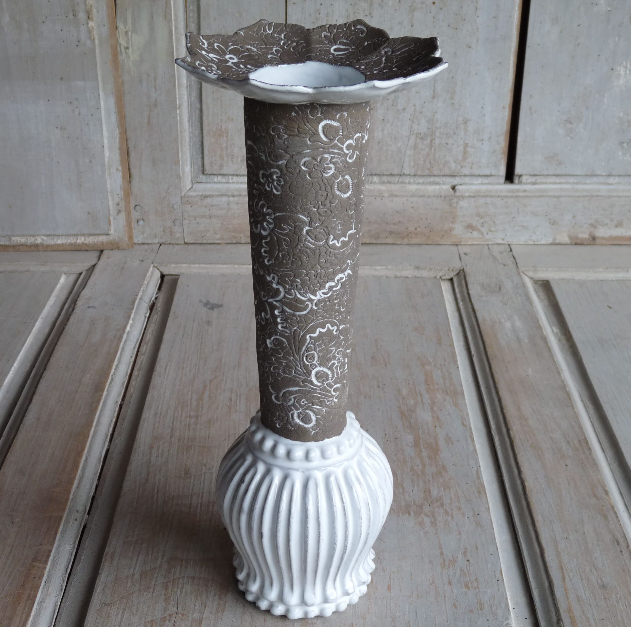 "Soliflor perles Deschamps " imaginé par Jean-Baptiste Astier de Villatte et réalisé en faïence brune émaillée en blanc brillant & Rébecca blanc désémaillé brun brut . Estampillé "JB AdeV, créations depuis 1993", éditeur.